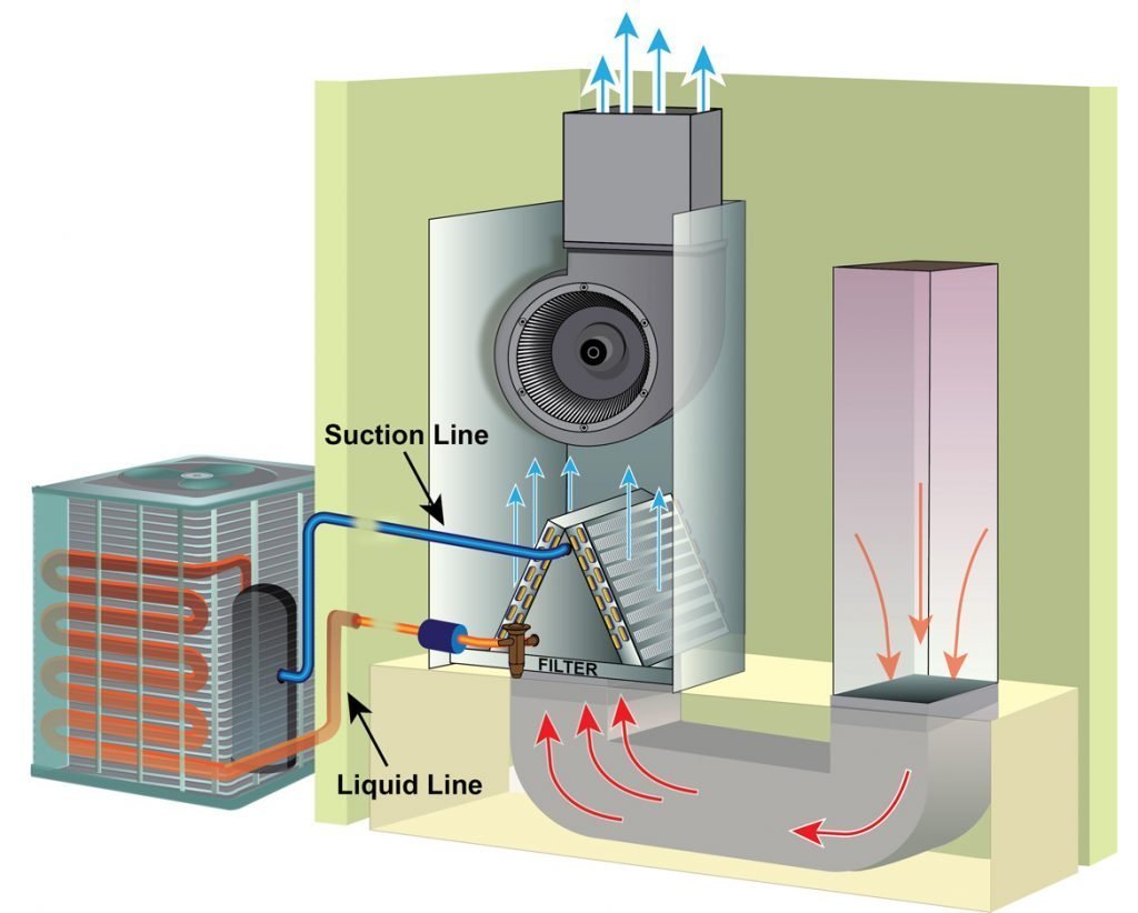 Figure 1: A basic layout showing the indoor air handler, refrigerant lines, and outdoor condensing unit.ย